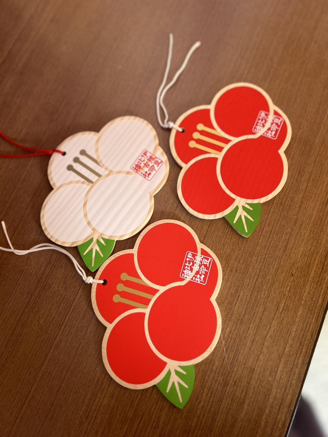赤い椿の絵馬は紐が白で、白い椿の絵馬は紐が赤なのもおしゃれで、デザインもかわいい……💞