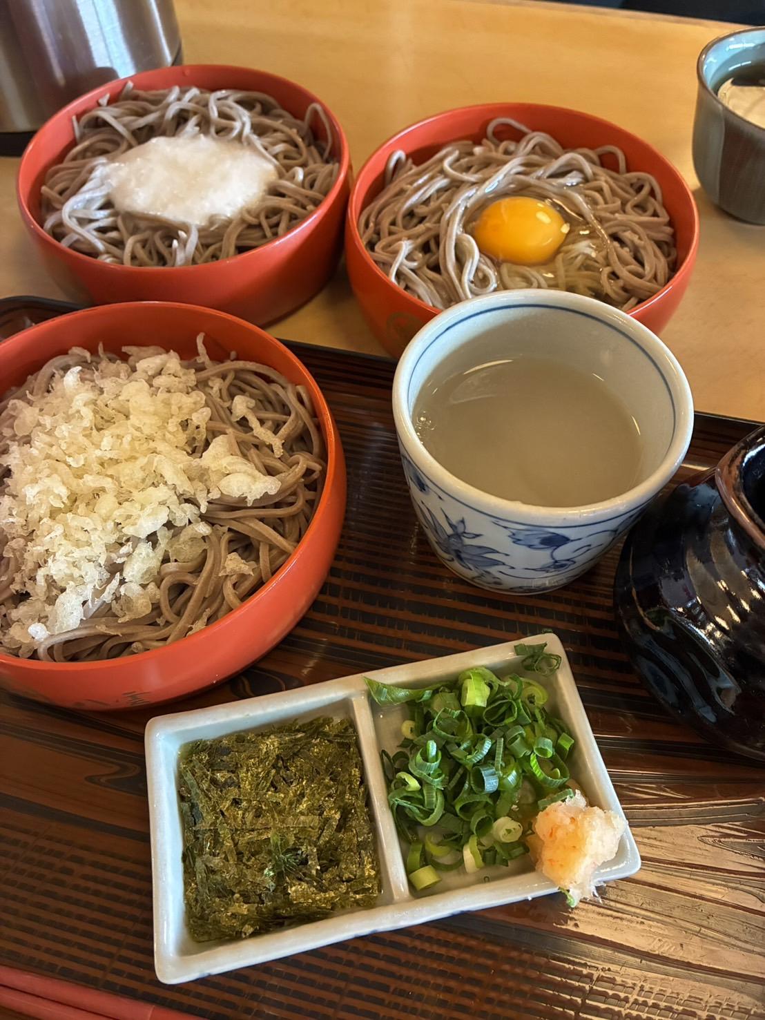 ヒナピーは、「割ごそば」といわれる丸い器に薬味とつゆをかけて食べるおそばを食べました。卵、とろろ、天玉が一段一段トッピングしてあり食べ比べできます!最後に残ったつゆをそば湯に入れて飲みました。