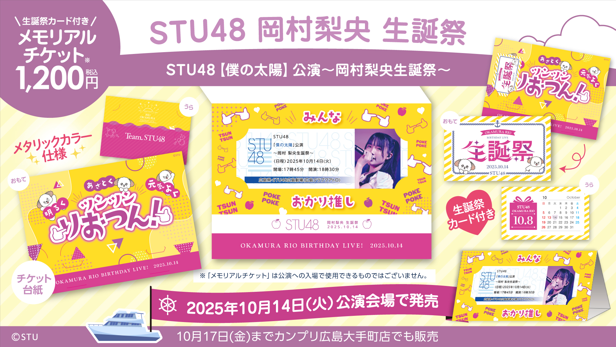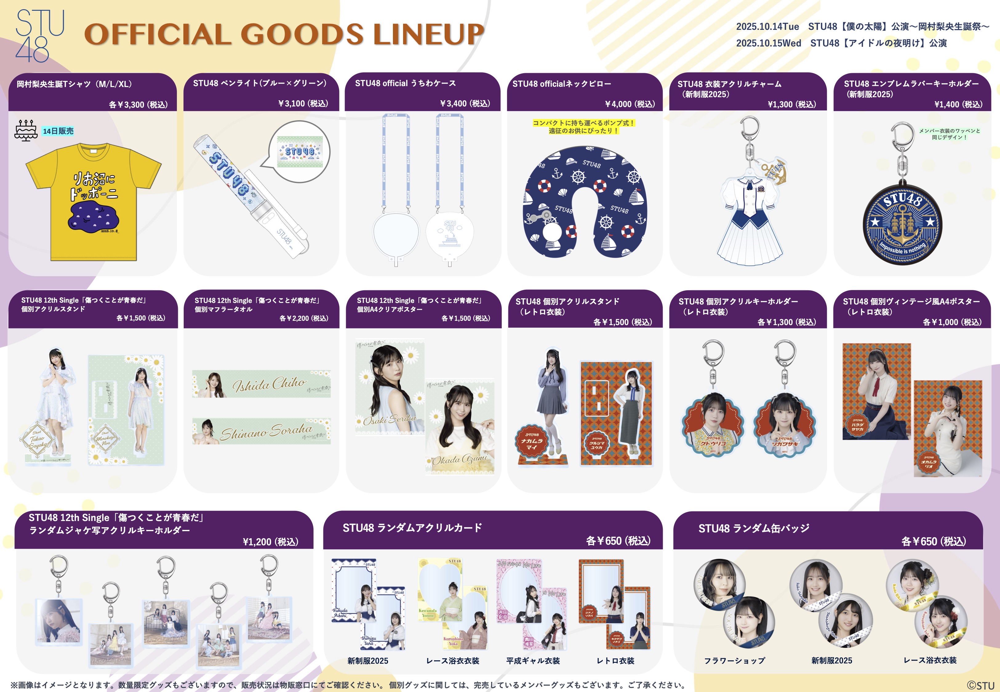 10月14日(火) STU48「僕の太陽」公演〜岡村梨央生誕祭〜、10月15日(水) STU48「アイドルの夜明け」公演、会場での物販実施のお知らせ