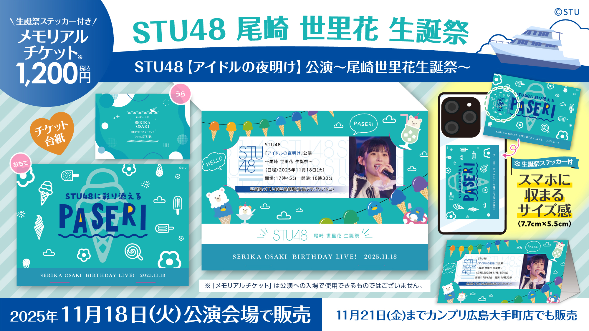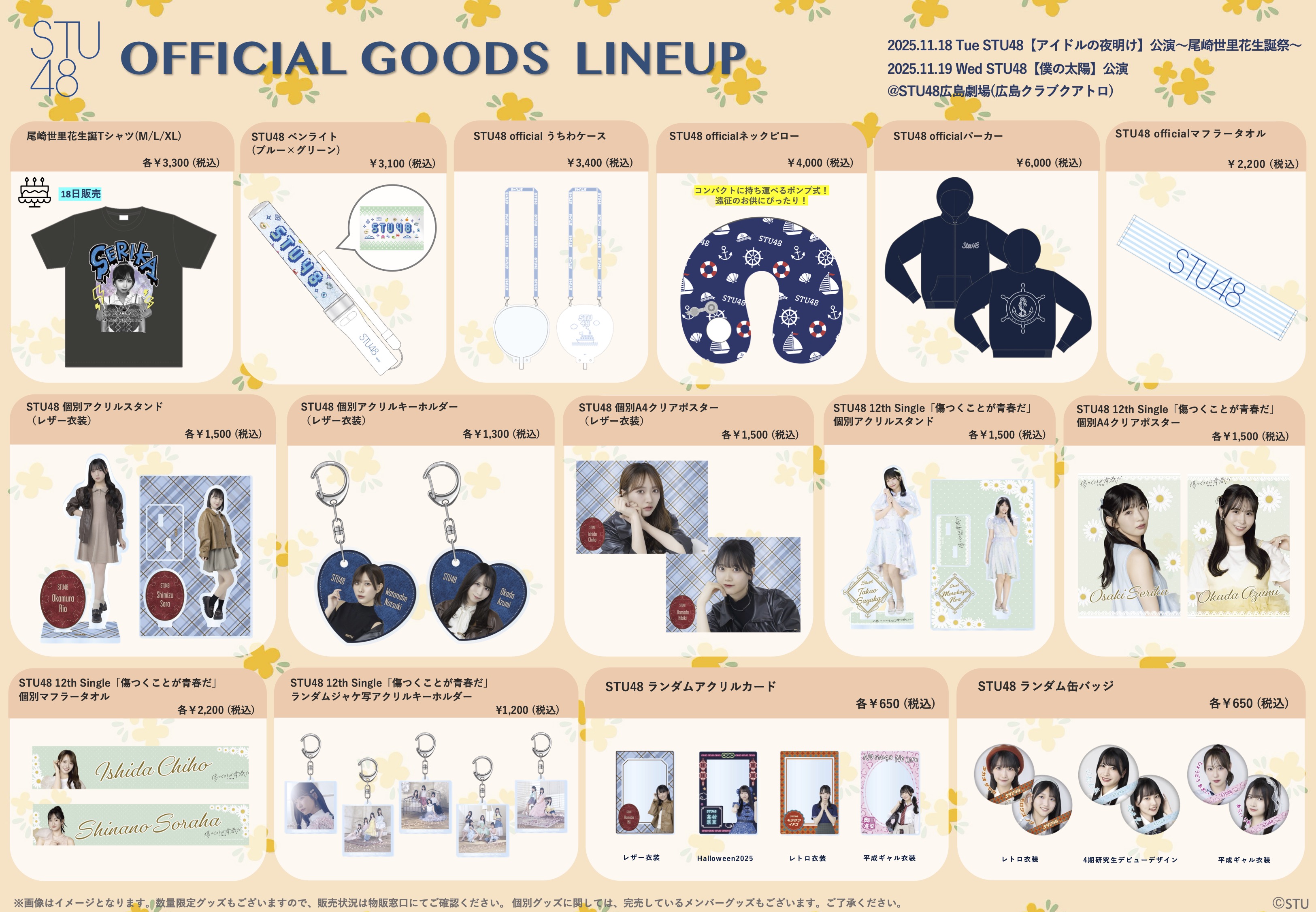 11月18日(火) STU48「アイドルの夜明け」公演〜尾崎世里花生誕祭〜、11月19日(水)STU48「僕の太陽」公演、会場での物販実施のお知らせ