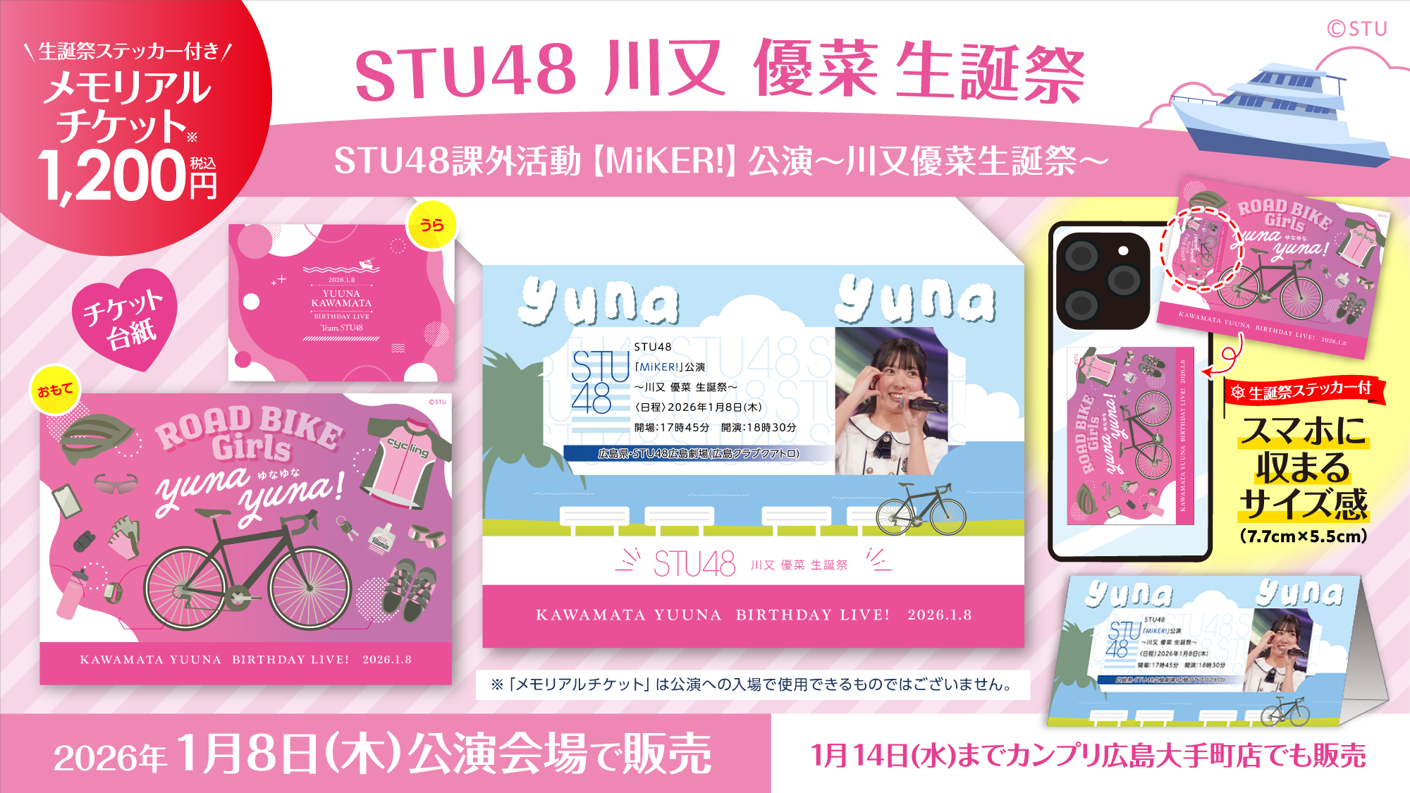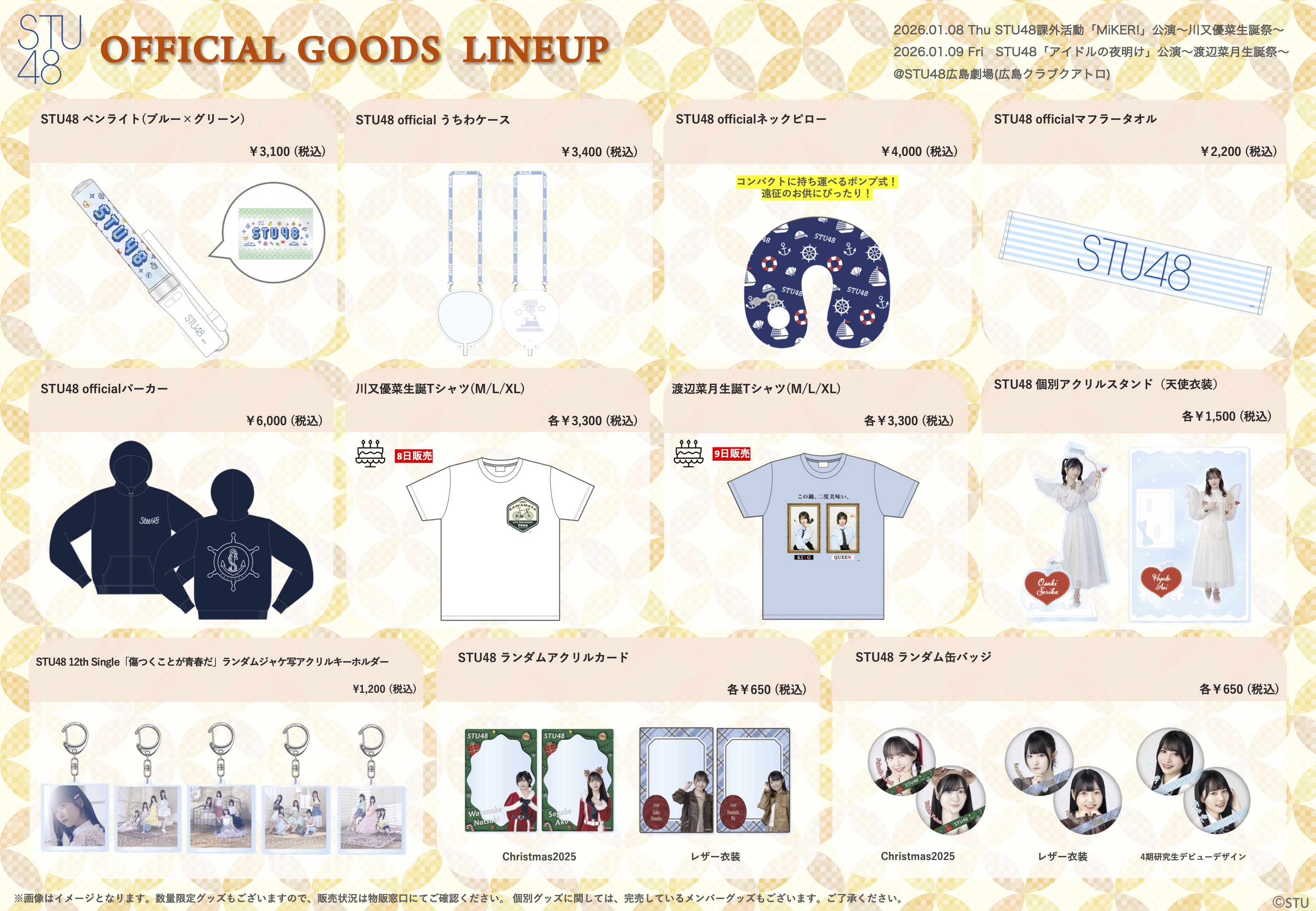 1月8日(木)STU48課外活動「MiKER!」公演〜川又優菜生誕祭〜、1月9日(金) STU48「アイドルの夜明け」公演〜渡辺菜月生誕祭〜、会場での物販実施のお知らせ
