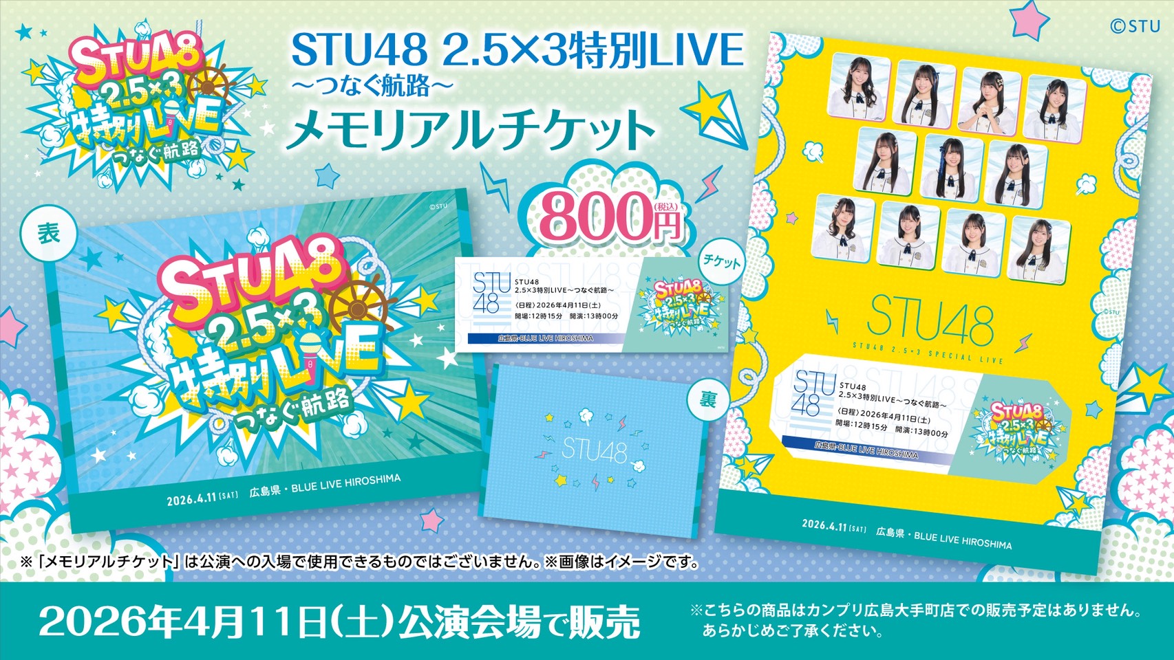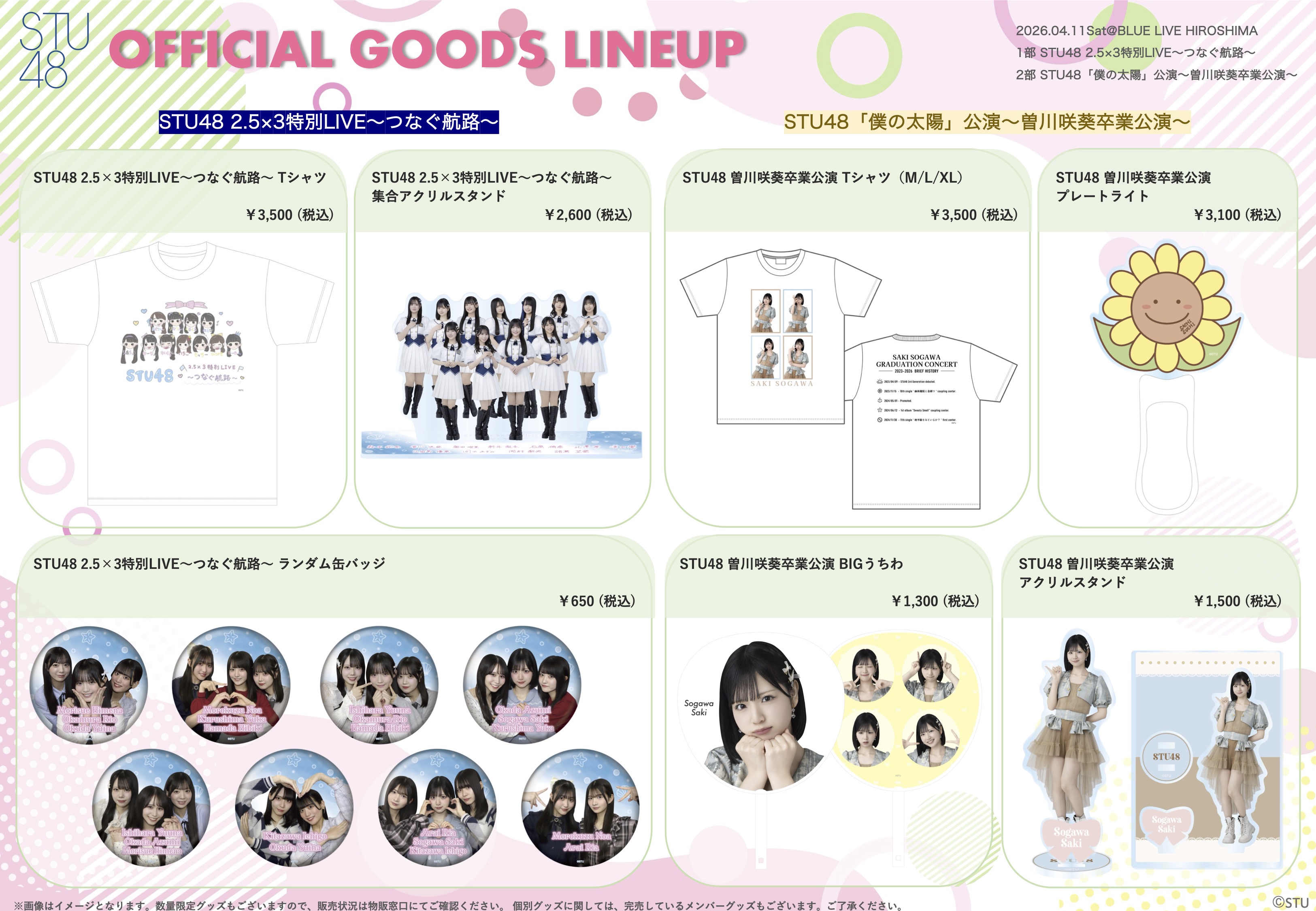 4月11日(土) 1部 STU48 2.5×3特別LIVE〜つなぐ航路〜、2部 STU48「僕の太陽」公演〜曽川咲葵卒業公演〜、会場での物販実施のお知らせ